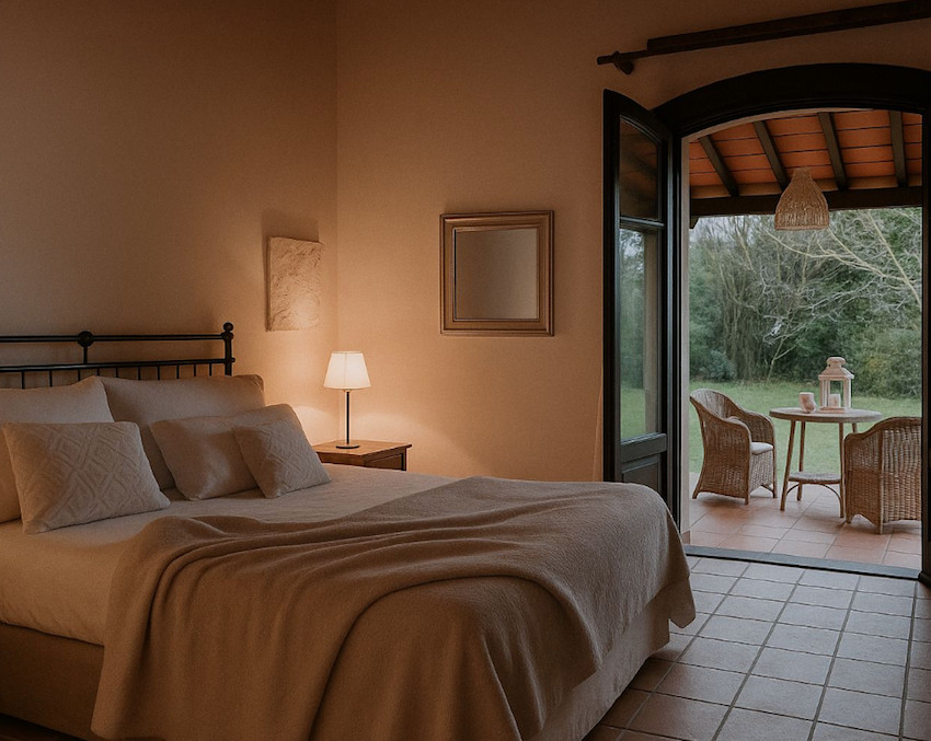 A birtokon több, jól elkülöníthető épület van. Az egyikben a recepció és az étterem kaptak helyet, a többi a vendégek elhelyezését szolgálja. A főépület klasszikus hotel szolgáltatást nyújt, 2-3 és 4 ágyas szobákkal, bad&breakfast ellátással, ezeknek az árában tehát már benne van a reggeli. A szobák mind egyedi berendezéssel rendelkeznek, jól tükrözve a részletekben a háziasszony művészetek iránti szenvedélyét, és kiváló ízlését. Az emeleti szobák standard, a földszintiek – kertkapcsolatuk okán – deluxe minősítést kaptak. Az igényességről, ugyanakkor otthonos hangulatról az elegáns kárpitok és ágyneműk gondoskodnak.