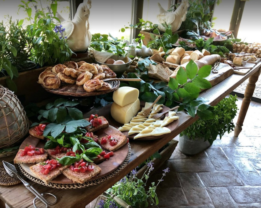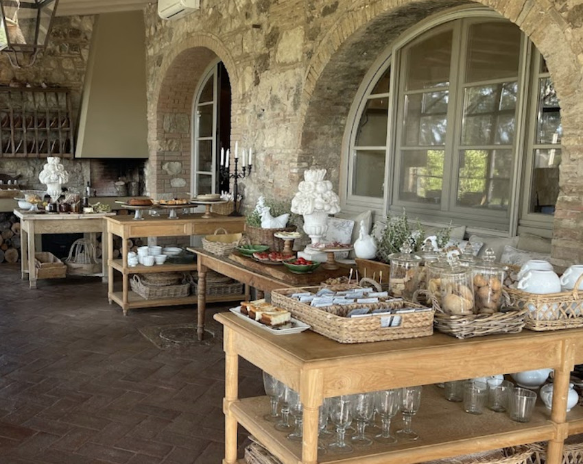 A reggelizőasztal szemet gyönyörködtető… és bár megvannak a toszkán hagyományok, amelyeket fontos tiszteletben tartani, természetesen minden igényhez tudnak alkalmazkodni, és szívesen elkészítik az egyedi igényeket. Az ebédidőre gyakorlatilag nincs kötelező előírás. Brunch, délebéd, vagy délutáni aperitif, a vendégek bármikor megkívánhatnak egy könnyű, nyári fogást, amelyet kedvük szerint fogyaszthatnak el a birtok különböző szegleteiben. A háziasszonyok autentikus toszkán ínyencségeket is kínálnak: nincs is üdítőbb nyáron egy finom panzanellá-nál, zuppa toscaná-nál, hideg rizs- vagy gersli salátánál!